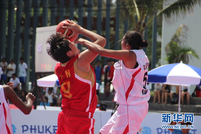11月16日,中国沙滩篮球运动员安静(左)在比赛中。中国体育代表团16日在泰国普吉举行的第四届亚洲沙滩运动会上勇夺2枚金牌和2枚铜牌。当天比赛全部结束时,中国队以3金2银5铜的成绩暂列奖牌榜第五。新华社发(塔纳摄)