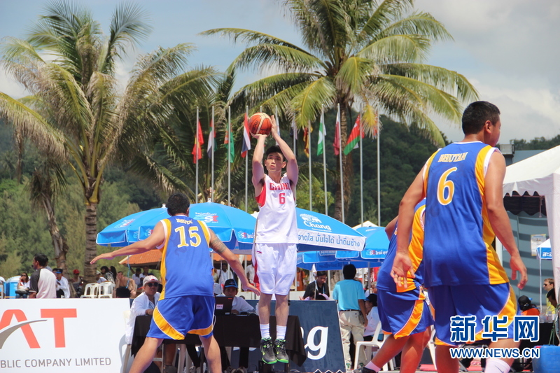 11月16日,中国沙滩篮球运动员刘洺宇(中)在比赛中。中国体育代表团16日在泰国普吉举行的第四届亚洲沙滩运动会上勇夺2枚金牌和2枚铜牌。当天比赛全部结束时,中国队以3金2银5铜的成绩暂列奖牌榜第五。新华社发(塔纳摄)