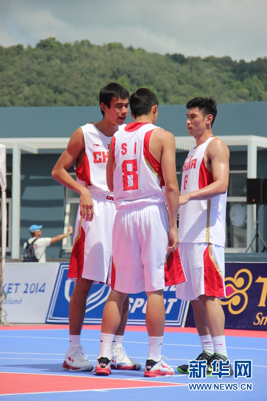 11月16日,中国沙滩篮球运动员刘桂均(左)、司坤(中)、刘洺宇(右)在比赛中场。中国体育代表团16日在泰国普吉举行的第四届亚洲沙滩运动会上勇夺2枚金牌和2枚铜牌。当天比赛全部结束时,中国队以3金2银5铜的成绩暂列奖牌榜第五。新华社发(塔纳摄)