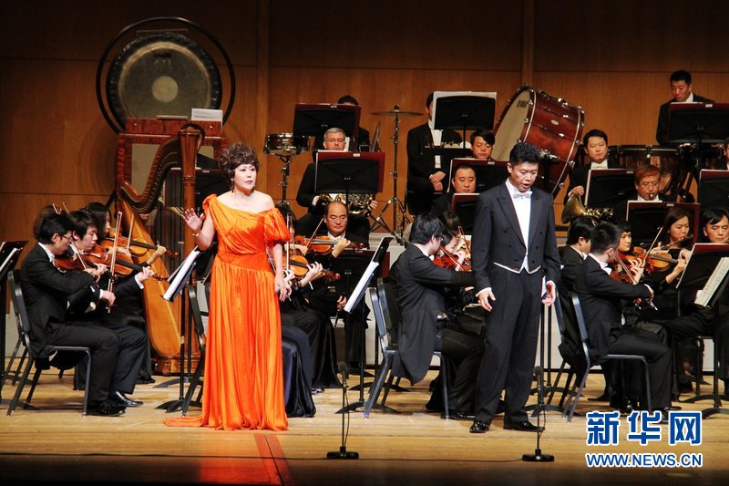 16日,首尔国立剧场,中央歌剧院歌唱家王威(左)和王海涛(右)在演唱。新华社记者彭茜摄