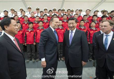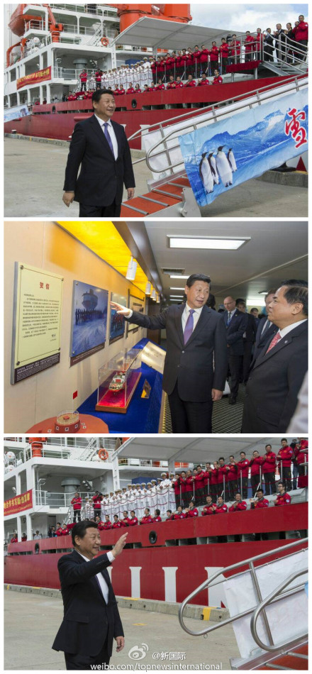 新华网北京11月18日电 据新华社“新国际”微博报道,蓝天白云,景色宜人。习近平主席18日在澳大利亚塔斯马尼亚州访问时来到霍巴特港,在阿博特总理陪同下登上正在这里补给的“雪龙”号极地科考船,在甲板上和全体队员合影,向大家问好。“这里离南极有多远?”“走几天?”合完影后,他伫立甲板,关切询问有关情况。