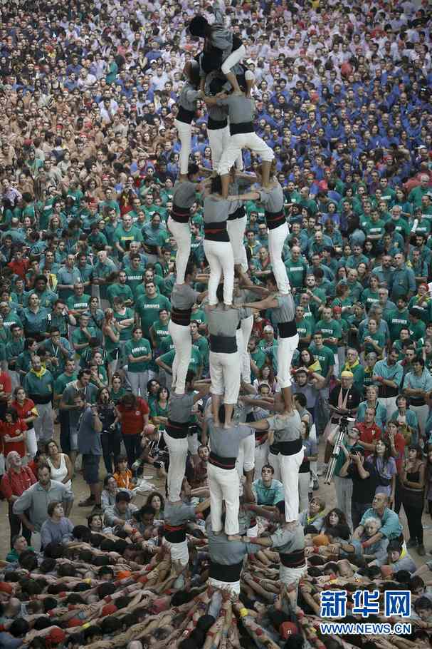 在西班牙加泰罗尼亚地区的塔拉戈纳市(Tarragona)举行的一次“叠人塔”大赛上,Jana爬到Sants区代表队的顶端。新华社巴塞罗那分社摄影师Pau Barrena 摄