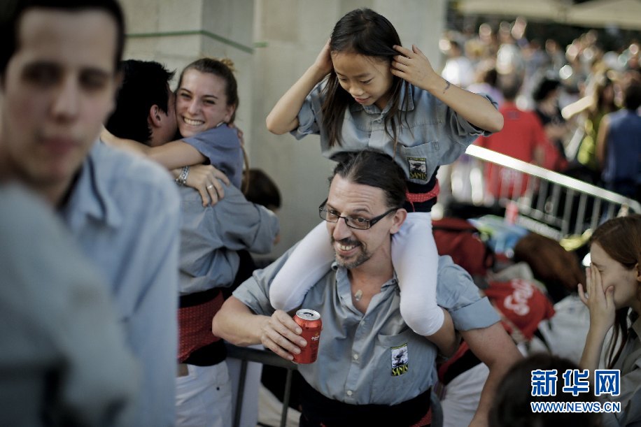 Jana骑在养父的肩膀上来到表演现场,两人一起准备参加一场在巴塞罗那进行的表演。新华社巴塞罗那分社摄影师Pau Barrena 摄