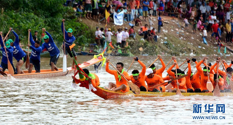 老挝龙舟节上的划龙舟比赛。(荣忠霞 摄)