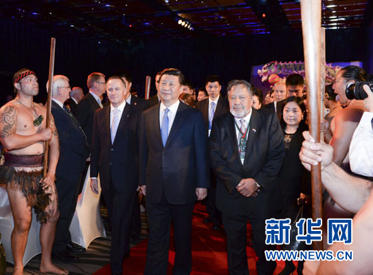习近平和夫人彭丽媛抵达时,新西兰总理约翰·基夫妇迎接,毛利族代表以传统方式欢迎。在毛利族勇士和中国舞龙引领下,习近平和彭丽媛步入大厅,全场起立鼓掌。毛利族青年用歌声表达喜悦和友谊。