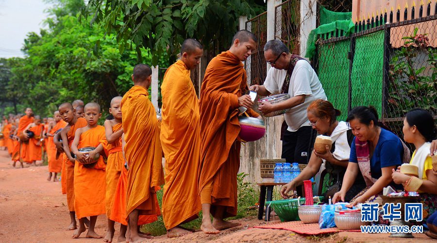 老挝每天清晨风雨无阻上演的“布施”盛景。(刘艾伦 摄)