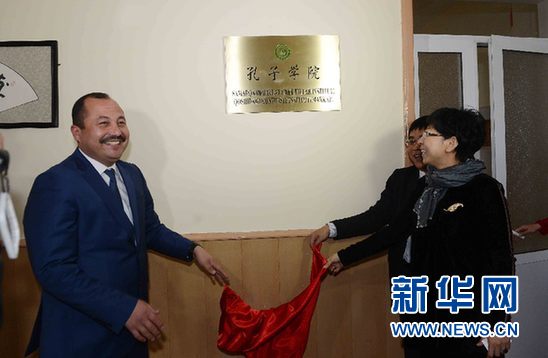 11月27日,乌兹别克斯坦撒马尔罕国立外国语学院礼堂,撒马尔罕国立外国语学院校长拉西莫夫(左)和中国驻乌兹别克斯坦大使馆邹艳辉参赞(右一)、上海外国语大学副校长周承一起为撒马尔罕孔子学院揭牌。(新华网记者 沙达提 摄)