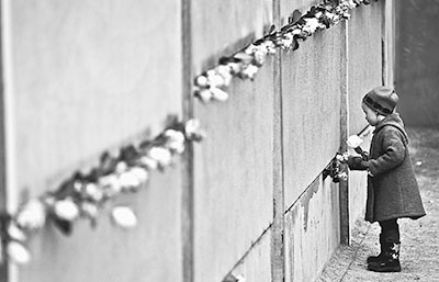 11月9日,德国首都柏林举行各种活动,纪念柏林墙倒塌25周年。图为一名小女孩在纪念活动上把花插进柏林墙里。