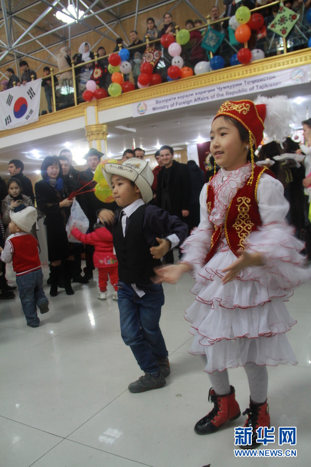 两个哈萨克斯坦儿童向观众表演民族传统舞蹈。