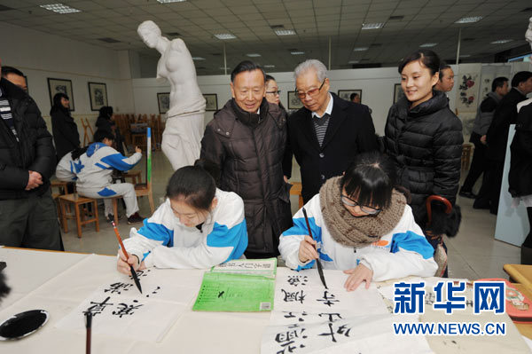 12月9日,中国政策科学研究会国家安全政策委员会会长、原武警部队司令员巴忠倓巴忠倓将军(中)和中国政策科学研究会国家安全政策委员会秘书长俞源将军(左一)观看西安高新一中学生练习书法。 裴兵 摄