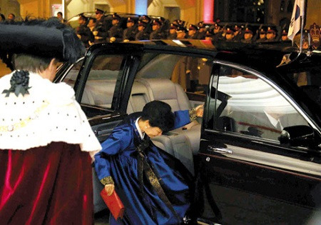 韩国总统朴槿惠在2013年11月访英期间,应伦敦金融城市长罗杰·吉福德邀请出席晚宴,因宾利车体较高,下车时脚下踩住蓝色韩服,导致身体向前跌倒。韩国青瓦台宣传首席秘书官李贞铉表示:“朴槿惠总统抵达晚宴场地时,因雨后路面湿滑,脚踩住韩服裙子后跌倒了。所幸没有受伤。”