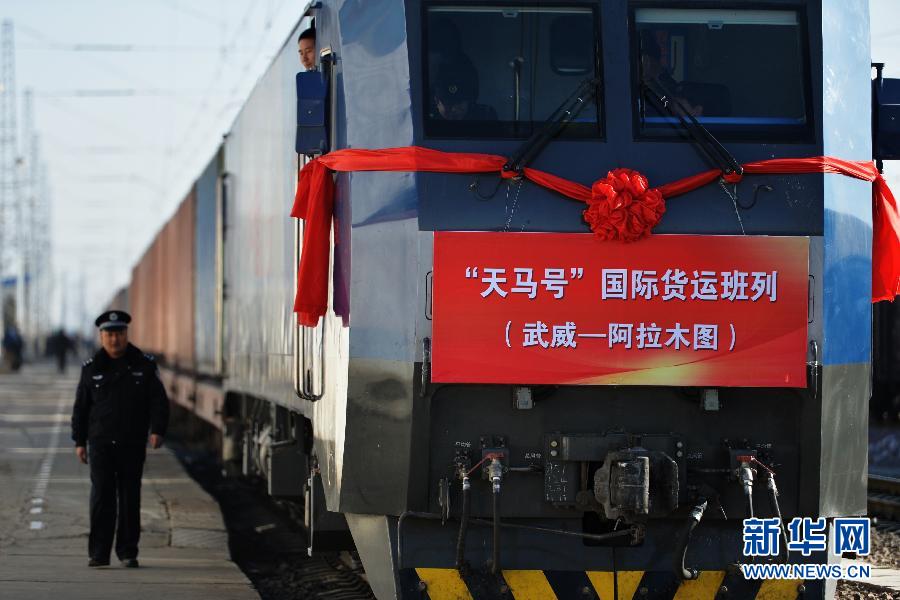 12月12日,“天马号”中欧国际货运班列旁准备出发。当日,中欧国际货运班列“天马号”从甘肃武威南车站出发,开始了前往哈萨克斯坦阿拉木图、全程约2646公里的首发行程。这趟班列共装载了机器设备、玩具、农产品等40个集装箱的1200吨出口货物,将在阿拉山口口岸换装出境,预计5天后到达目的地。据了解,“天马号”中欧国际货运班列是由武威保税物流中心牵头,俄、白、哈、德四国铁路公司和武威市政府、兰州铁路局共同参与建设的中欧间快速定期货运班列,未来将直达荷兰鹿特丹。新华社记者 陈斌 摄