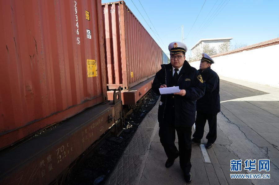 12月12日,两名海关工作人员在“天马号”开车前检查登记。当日,中欧国际货运班列“天马号”从甘肃武威南车站出发,开始了前往哈萨克斯坦阿拉木图、全程约2646公里的首发行程。这趟班列共装载了机器设备、玩具、农产品等40个集装箱的1200吨出口货物,将在阿拉山口口岸换装出境,预计5天后到达目的地。据了解,“天马号”中欧国际货运班列是由武威保税物流中心牵头,俄、白、哈、德四国铁路公司和武威市政府、兰州铁路局共同参与建设的中欧间快速定期货运班列,未来将直达荷兰鹿特丹。新华社记者 陈斌 摄