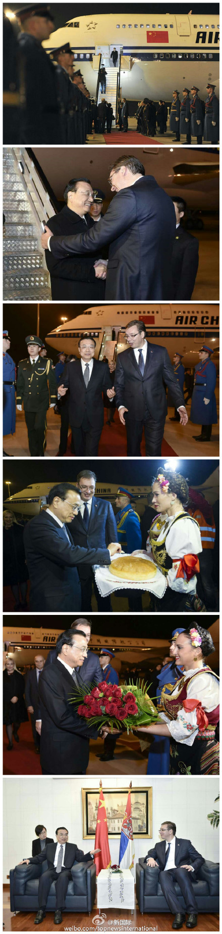 新华网北京12月16日电 据新华社“新国际”微博报道,当地时间15日晚,李克强总理乘专机抵达塞尔维亚首都贝尔格莱德,出席中国-中东欧领导人会晤并正式访塞,塞总理武契奇率两位副总理及多位部长到机场迎接,塞女青年按照迎接贵宾的传统礼仪献上面包和盐请他品尝。两国总理在机场进行了亲切会见。