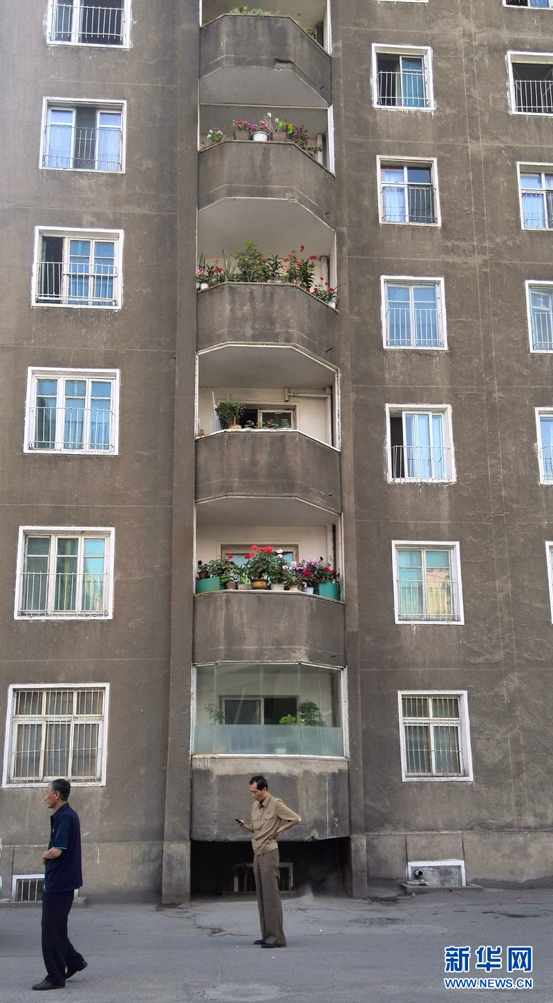 朝鲜路旁的高楼,阳台无晾衣服,有鲜花摆放