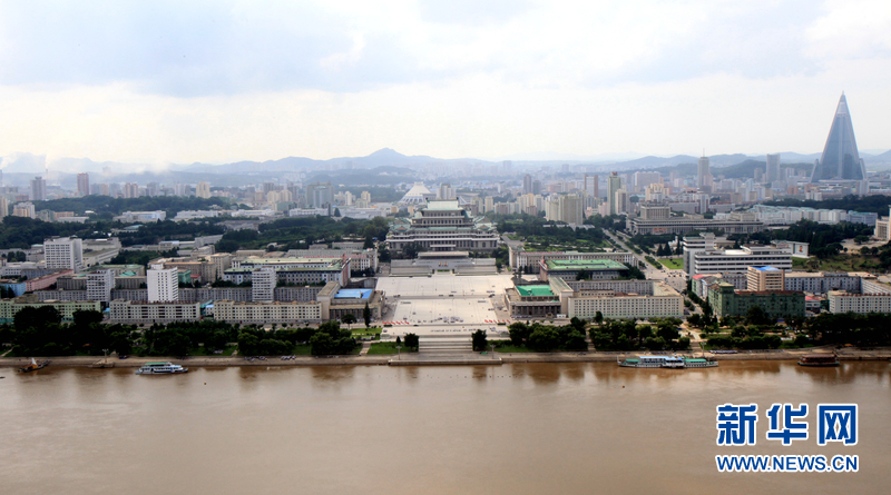 鸟瞰平壤—江为大同江,广场为今日长广场(意义相当北京天安门广场),此图是在平壤最高建筑主题思想塔上拍摄,正值朝鲜雨季,河水暴涨且浑浊,2012当年朝鲜发生过水灾。