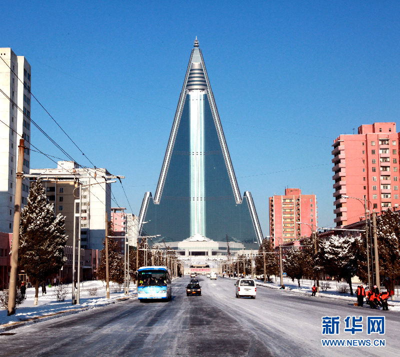 平壤又称“柳京”,此为平壤柳京大厦,是一幢未完工的摩天大楼,整体结构成三角金字塔型,斜面角度为75度,共105层,高330米。据称,柳京大厦原计划成为拥有3000间客房的超级大厦,并成为全球最高的饭店之一,计划于1989年开始营业。然而自从1982年开始建设之后,1992年完成结构工程后便一直停工,成为世界上最大的“烂尾楼”,至今也未启用。