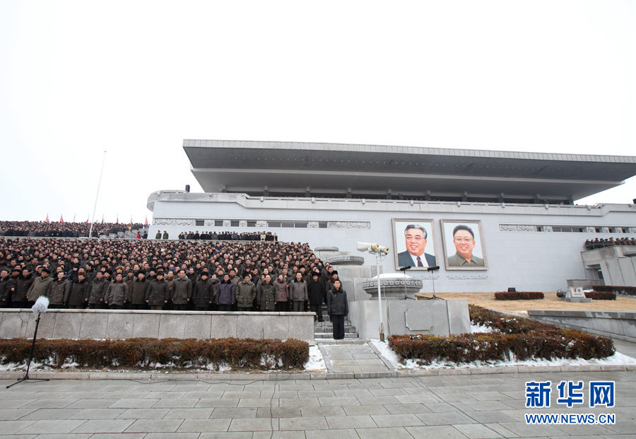 十万人参加的军民大会,金日成广场看台上的群众。新华社记者 曾涛摄
