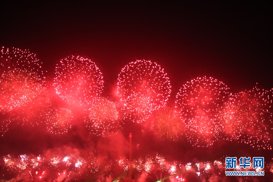 2012年“4·15”太阳节大同江畔主体思想塔上空的烟火。 新华社记者曾涛摄