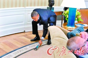 白宫近日公布的一张照片显示,奥巴马卷起一本杂志后蹲下,精准地打死落在地毯上的苍蝇。