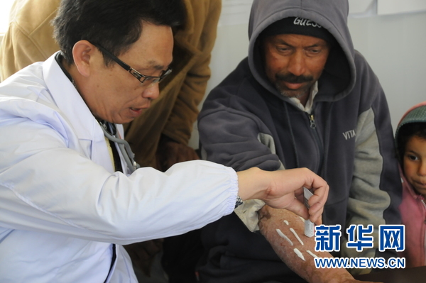 许金水为一位突尼斯工人治疗皮肤病。突尼斯记者陈斌杰 摄