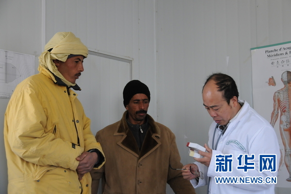 杨林全向突尼斯工人介绍药品如何服用。突尼斯记者陈斌杰 摄