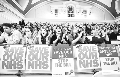 2012年3月7日,国民健康服务体系员工在伦敦威斯敏斯特议会中央大厅集会,反对政府新的社会医疗法案。