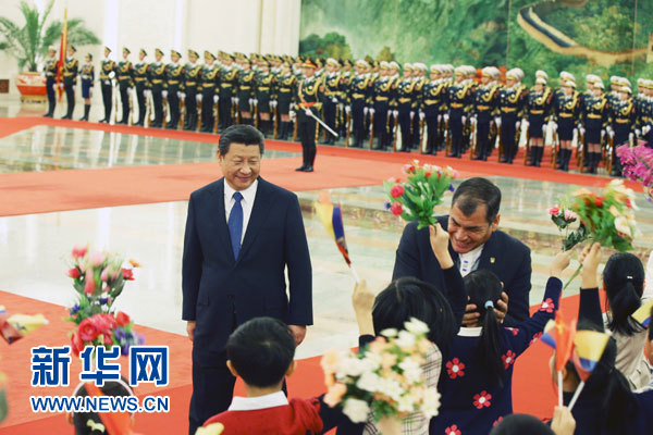 1月7日,国家主席习近平在北京人民大会堂同厄瓜多尔总统科雷亚举行会谈。这是会谈前,习近平在人民大会堂北大厅为科雷亚举行欢迎仪式。新华社记者姚大伟摄