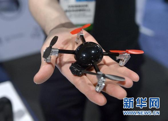 1月6日,在美国拉斯韦加斯举行的2015年国际消费电子展上,一名工作人员展示一款带摄像头的迷你民用无人机。 2015年拉斯韦加斯国际消费电子展首次开设民用无人机展区,成为本次展会的一大热点。据展会主办方美国消费电子协会预测,2015年全球民用无人机销量将达到40万架,销售额达到1.3亿美元,比去年增长55%。 新华社记者 殷博古 摄