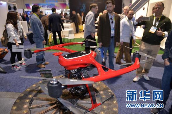 1月6日,在美国拉斯韦加斯举行的2015年国际消费电子展上,一家中国企业展示可携带专业单反摄影器材的无人机。 新华社记者 殷博古 摄