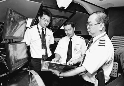 根据波音公司发布的《2014年飞行员和技师展望》报告,未来20年亚太地区仍需要21.6万名飞行员和22.4万名维修人员,是全球需求最大的地区。图为在位于马来西亚雪邦州的亚航飞行员培训学院,飞行员进行培训。