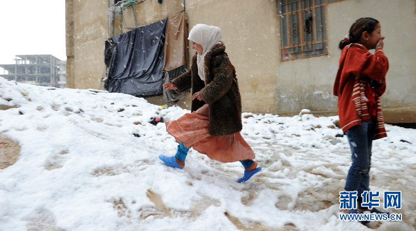 2015年1月7日,在叙利亚首都大马士革(Jaramana)地区,两名女孩穿着拖鞋在雪地上嬉戏,感受不一样的冬天。新华社记者张迺杰摄
