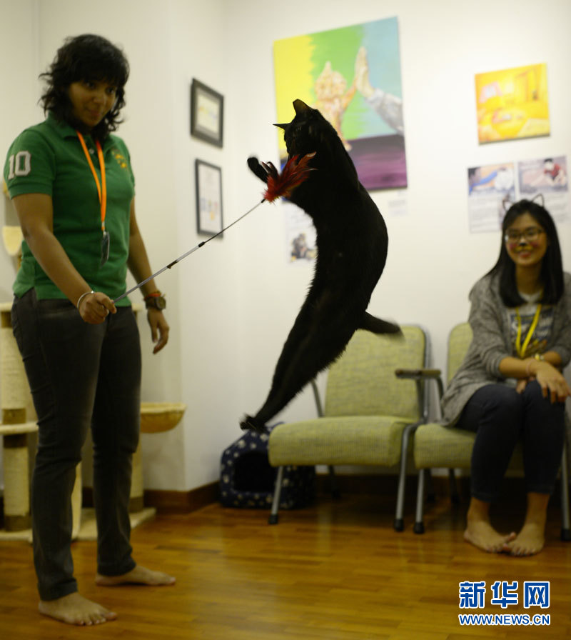 1月9日,志愿者与猫咪在新加坡“猫咪博物馆”有互动。当日,新加坡首个“猫咪博物馆”开幕。邓智炜摄