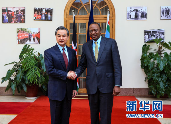 肯雅塔表示,很高兴中国外长新年伊始首访肯尼亚,这充分体现了肯中全方位友好合作关系。肯中都致力于促进平等、公平、发展,都坚定捍卫国家主权,两国相互学习借鉴,加强合作,不仅符合各自利益,也将有利于维护发展中国家整体利益。肯尼亚正聚焦经济发展,视中国为强有力合作伙伴,愿进一步巩固和加强两国伙伴关系。肯方感谢中方长期以来给予的支持和帮助,希望继续在互联互通等基础设施建设、能源、电力等领域得到中方有力援助,在非洲和平与安全、联合国等国际事务中进一步加强相互支持与配合。