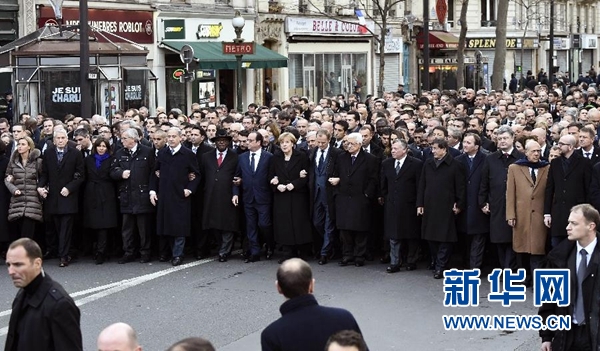 新华网巴黎1月11日电(记者尚栩 韩冰)法国首都巴黎当地时间11日下午举行反恐大游行,法国政要、40余位外国领导人以及一些国际和地区组织负责人参加了游行。