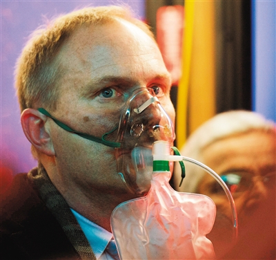 一名在地铁里吸入浓烟的乘客,被救出后吸氧来保命。