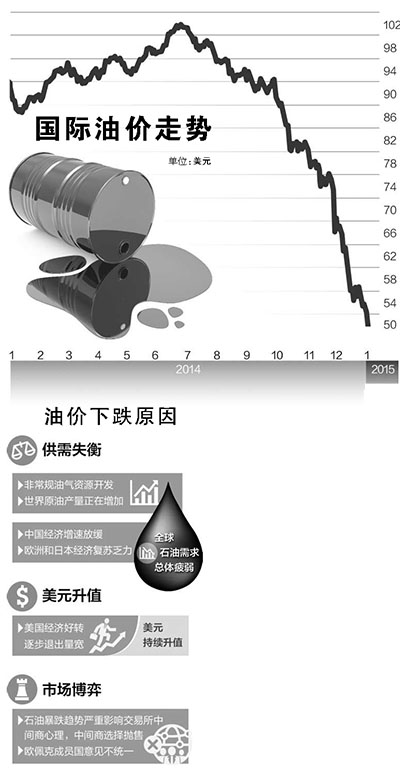 黄晓勇:国际油价自去年夏天起大幅降低,市场供需趋于宽松是首要因素。一方面,中国经济增速放缓,欧洲和日本经济复苏乏力,全球石油需求总体疲弱。另一方面,非常规油气资源的开发实现了更具经济效益的使用,世界原油产量正在增加:美国页岩气革命使其原油产量创30年新高;深海石油开采等新技术的开发和运用,扩大了石油生产领域;此前遭受战乱的利比亚和伊拉克等国油田恢复开采;一批新的石油输出国正在崛起,如墨西哥、巴西和哥伦比亚等——石油供给的多极化和总量的增加,客观上有助于油价走低。