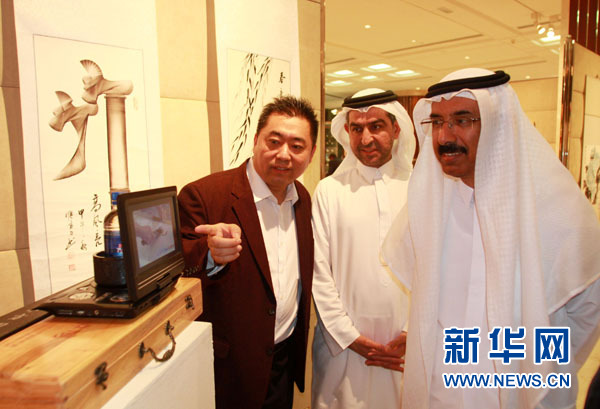 来自河南的刀笔画家王濮方(左)在向阿联酋联邦国民议会议长穆罕默德•莫尔介绍作品。