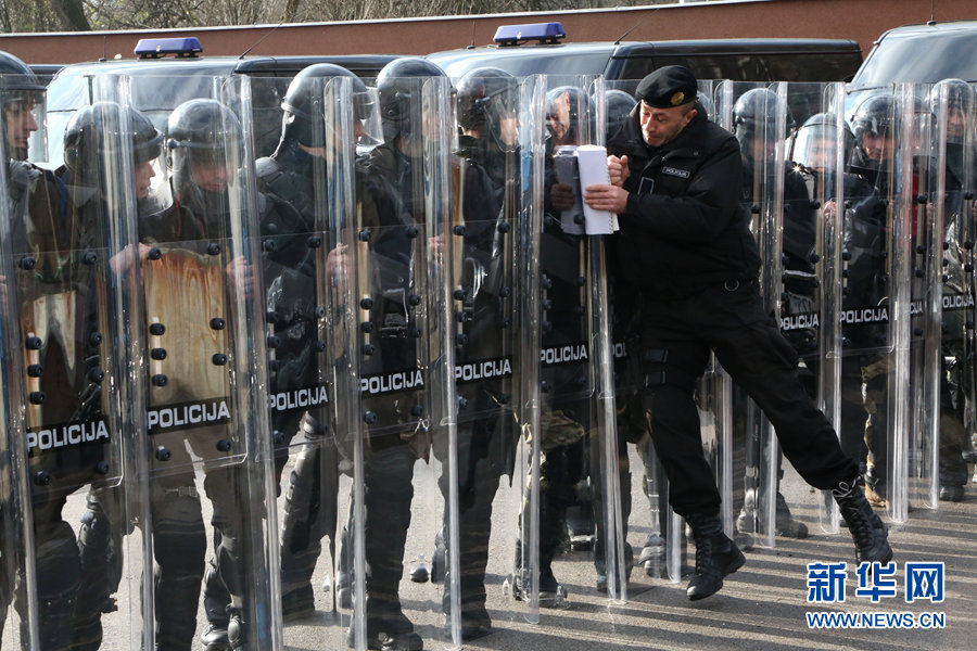 波黑特种警察部队人数不多,但装备精良,训练有素,对维护波黑治安发挥着极其重要的作用。波黑局势总体稳定,但突发事件仍不时发生。波黑上世纪90年代经历战争,大量枪支遗落民间,存在不小的治安隐患。图为对付游行或者骚乱而进行的密集防护训练。新华网发 哈里斯 摄