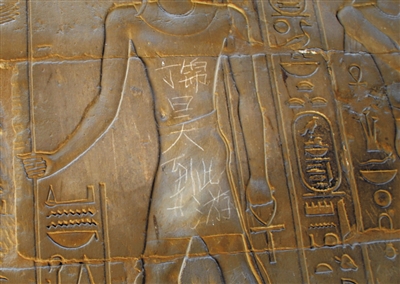 2013年5月,网友“@空游无依”发微博,称在埃及卢克索神庙的浮雕上,看到了 “***到此一游”几个字,“我们试图用纸巾擦掉这羞耻,但很难擦干净,这是三千五百年前的文物呀。”沈先生提供的图片显示,这行字被划在浮雕上一名男性人物的上半身,“到此一游”四字较小、较模糊,“丁锦昊”三个字比较大,“昊”字占了该男性一个腰身。