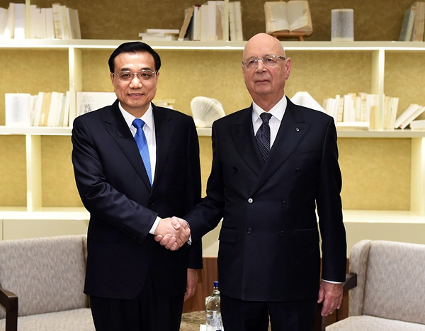 (克强总理在下榻酒店会见施瓦布。摄影:李涛)
