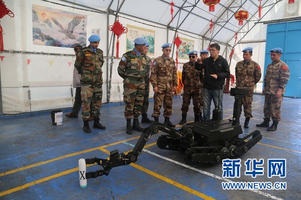 1月18日,中科院专家飞赴黎巴嫩,帮助第13批赴黎维和工兵分队修理维和装备。图为中科院工程师王挺(右三)正在向到中国营视察工作的联黎副司令部卡曼将军(左二)介绍防爆机器人性能。柴印摄