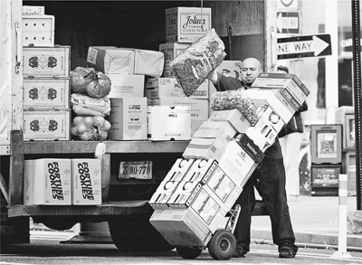 美国政府近日发布报告称,虽然美国经济复苏创造了很多新的就业机会,但这些新工作岗位的工资水平比较低。图为在首都华盛顿,一名美国杂货店工人正在卸货。 人民视觉