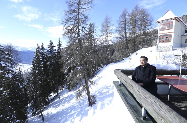 上了山顶,才明白咱总理为什么要来。达沃斯小镇地处阿尔卑斯山脉,周围群山环抱。海拔1800米的沙茨阿尔卑山顶视野极好,极目远眺,蓝天,白云,雪峰,苍松,周围静谧得似乎只剩下积雪掉落的声音。