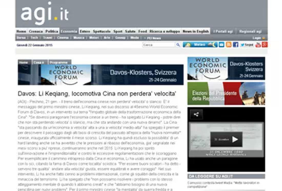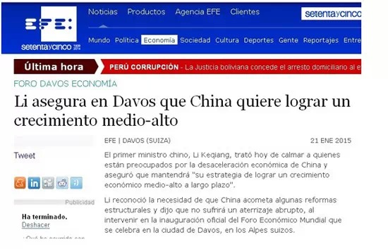 22日,西班牙埃菲社报道了李克强总理在达沃斯世界经济论坛上的致辞,特别提到他就中国经济增速放缓的回应。报道中引用李克强总理的话:“中国经济进入新常态,经济由高速增长转为中高速增长。发展则必须由中低端水平迈向中高端水平,为此要坚定不移地推动结构性改革。”