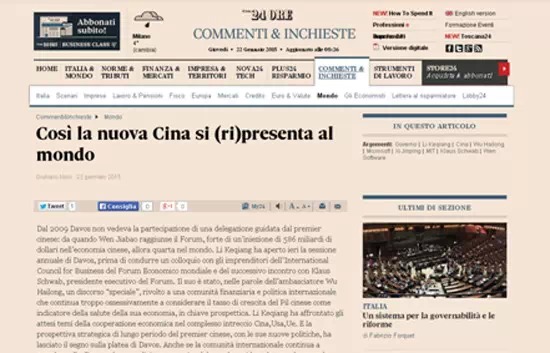 意大利24小时太阳报1月22日发表题为《中国重新向世界自我介绍》的评论性文章,介绍了李克强在世界经济论坛上的讲话。文章称,虽然国际社会一直在用西方国家的种族主义中心心态以及旧的眼光看待中国,中国国务院总理李克强的长期战略眼光和他的新政策还是给达沃斯的听众们留下深刻印象。