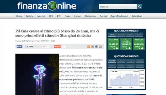 意大利财经在线网站1月20日发表文章称虽然2014年中国的国内生产总值是24年来最低,但工业生产、零售业和股市都释放出健康和积极的信号。