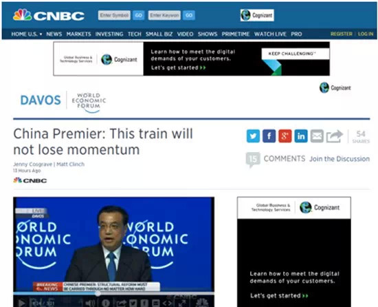 其中,美国CNBC新闻台1月22日刊文,以“火车动能不减”为题,形容李克强总理提到的不会“硬着陆”的中国经济。李克强总理在致辞中以列车形容中国经济“新常态”,指出,中国经济的列车不会因“有所放缓而失速,反而会跑得更稳健”。文中还援引李克强在会上的发言,指出中国将“坚定不移地推动结构性改革”,推动自贸区、国际间经济合作的建设与发展。