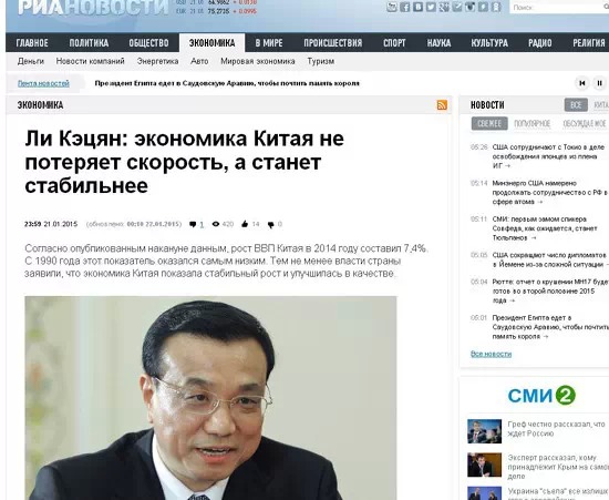 俄新社以一篇题为《中国经济不会失速,而会更加稳定》的文章,报道了中国经济的发展前景。文中称,2014年中国经济发展速度是7.4%,这是1990年以来的一个低点,但中国经济的发展正在体现“新常态”,即体现在质的提升。