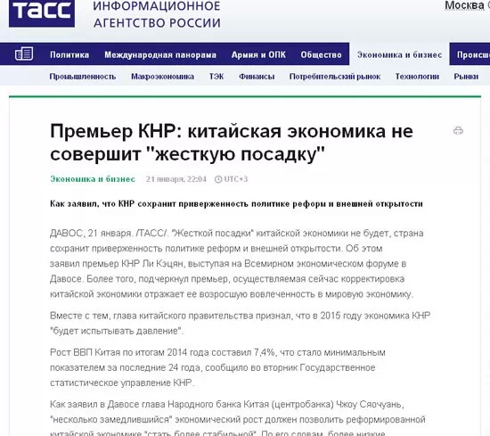 塔斯社发表了一篇名为《中国总理:中国经济不会硬着陆》的文章。文中指出,李克强和中国央行行长周小川在达沃斯论坛期间均表示,中国将深化改革开放,渐缓的增长速度有利于中国经济的转型。在3月份举行的中国两会上,中国政府将提出新的经济发展规划,速度肯定不会是北京追求的首要目标。
